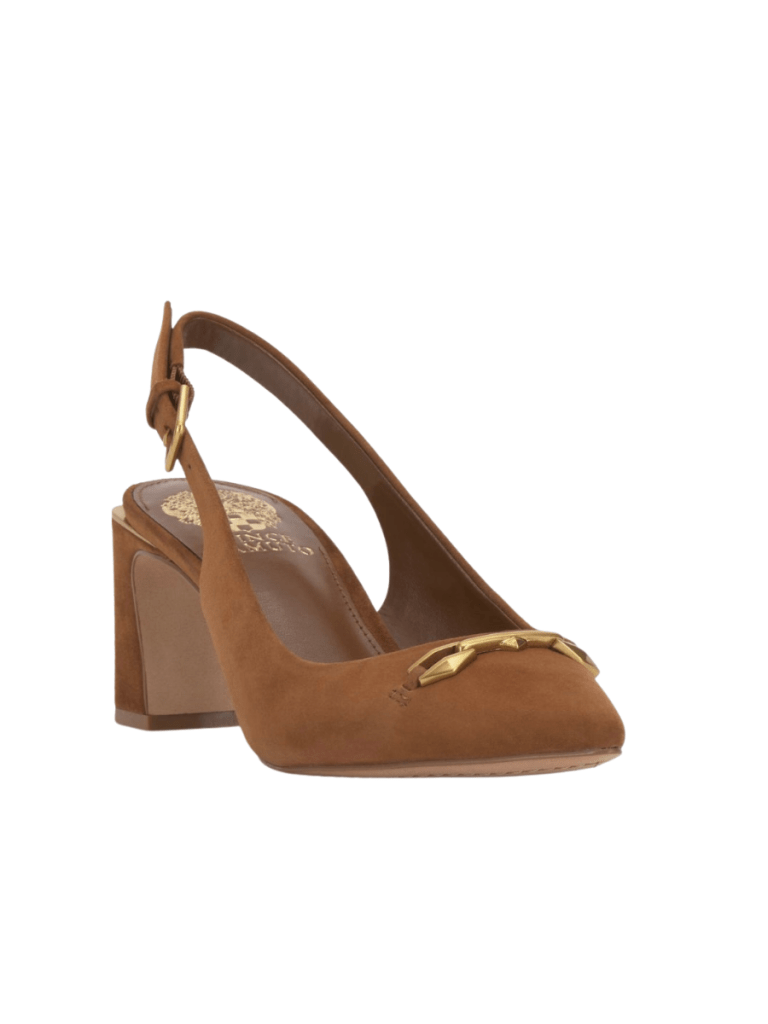 These Vince Camuto shoes are a modern classic that instantly adds elegance to every outfit. The pointy toe shape elongates the leg, and the slingback design creates a sophisticated silhouette. Also, the geometric hardware detail brings high style.