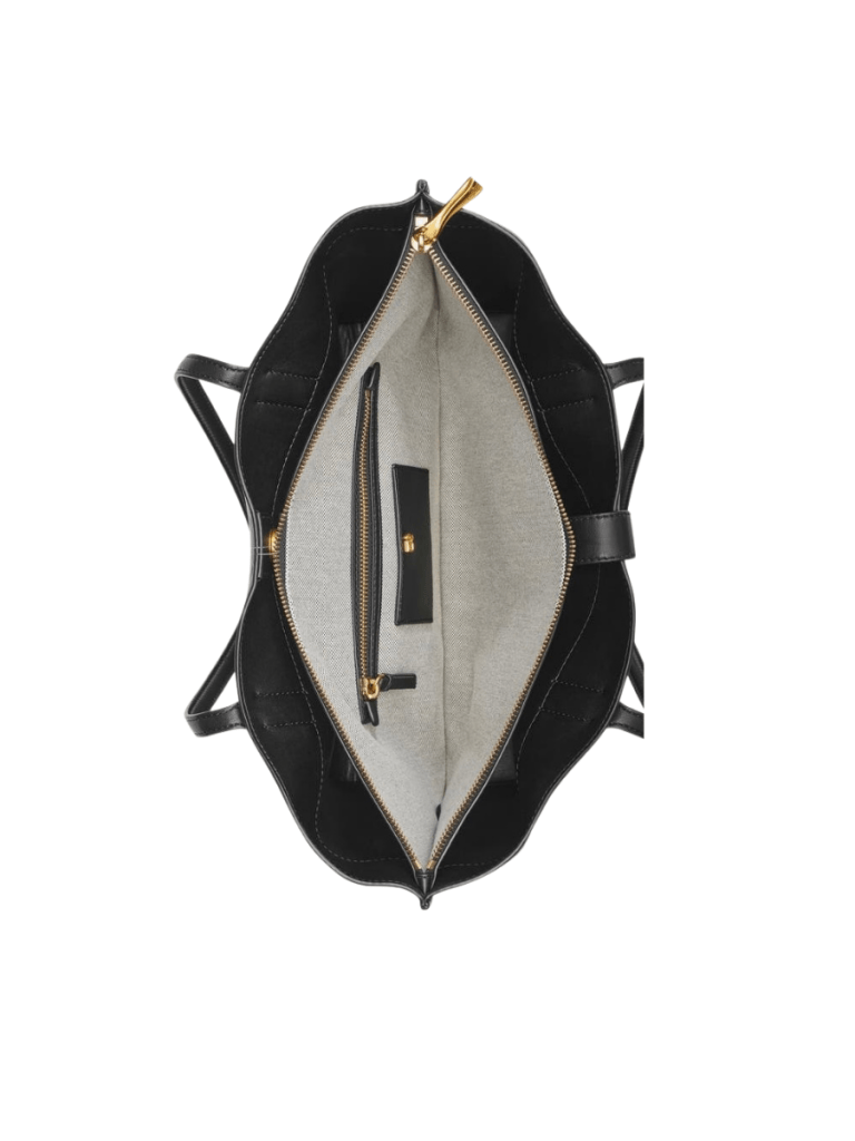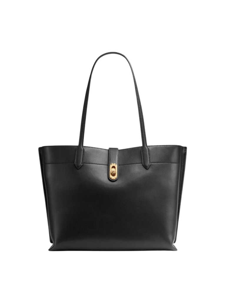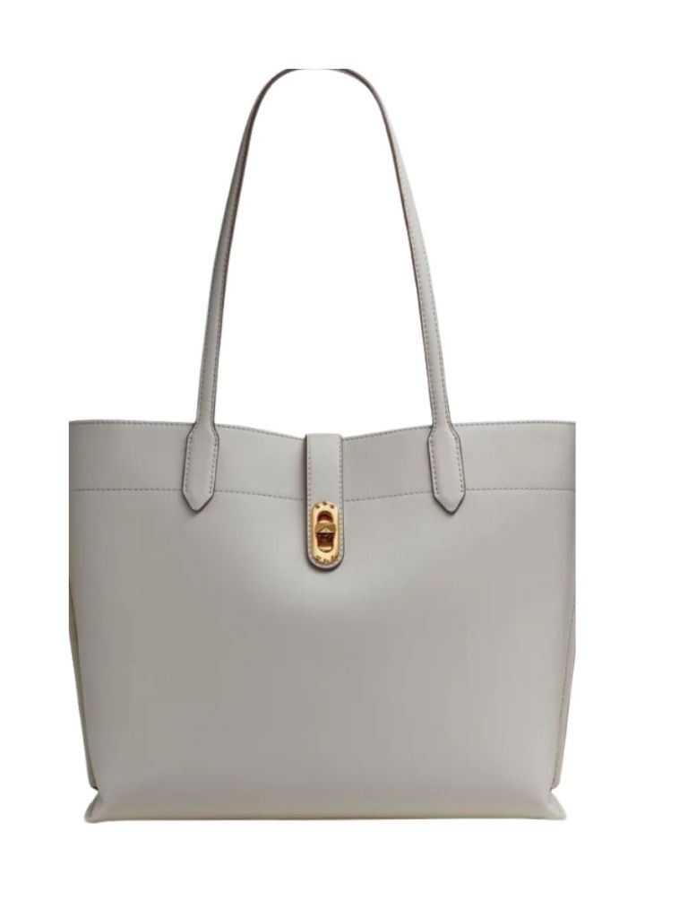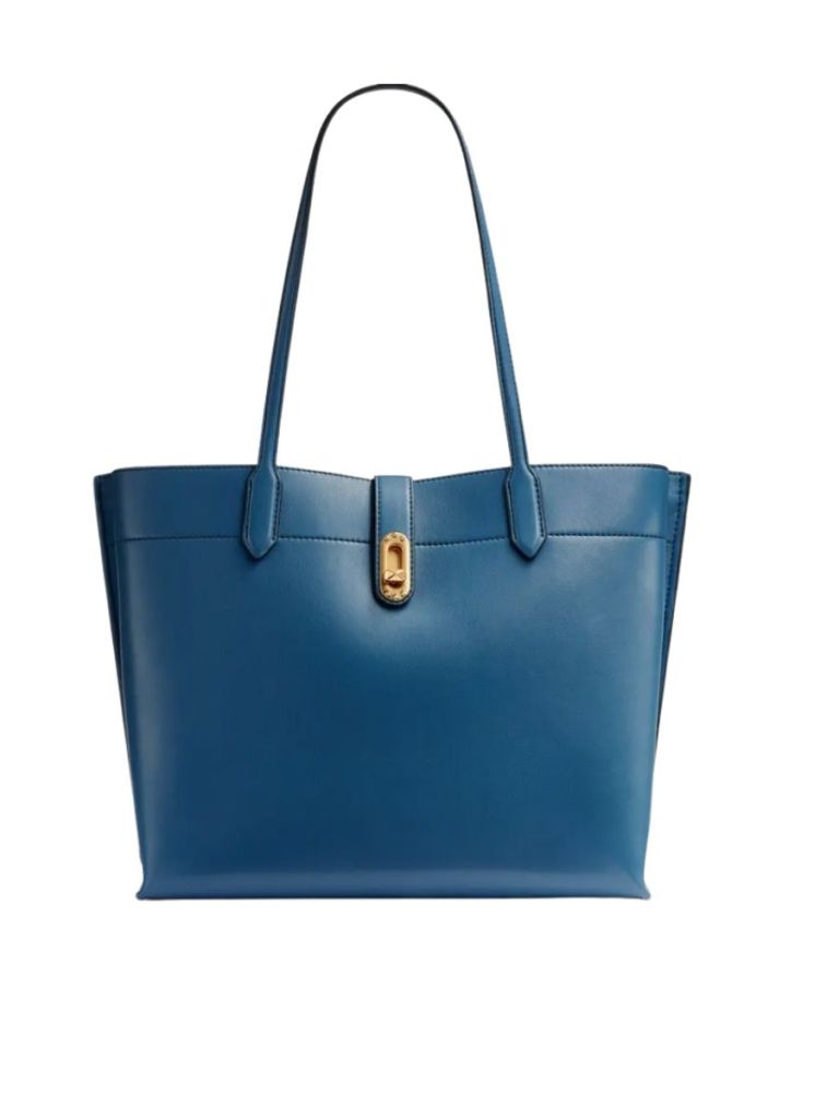 The interior of this tote is functional, featuring a center zip compartment, and it has a signature touch with a gold-tone turn lock. It comes in classic black, light sand, and a gorgeous peacock blue.