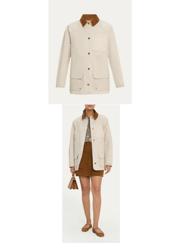 This chic barn jacket by Veronica Beard elevates casual outerwear with refined details and premium construction. The relaxed silhouette gives it comfort while maintaining elegance for modern lifestyles. She can wear it with jeans or a suede skirt with knee-high boots.