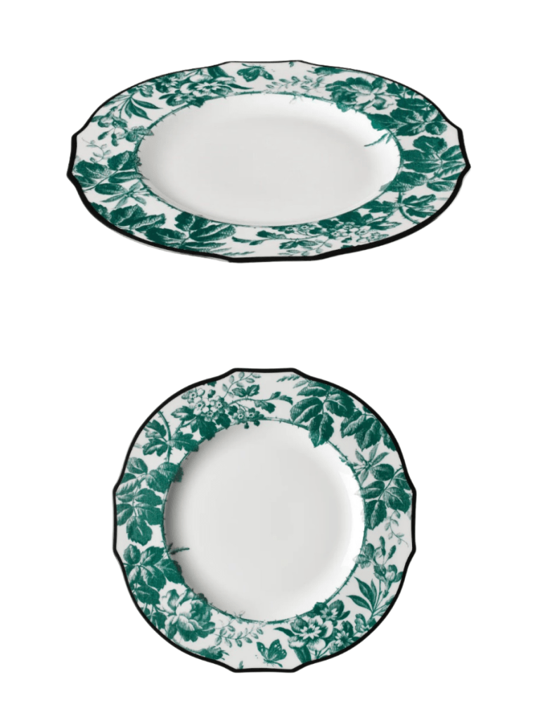 Gucci’s venture into tableware brings the house’s distinctive maximalist aesthetic to the dining experience, and the Herbarium collection showcases why fashion and food presentation make a great combination. These dinner plates feature the brand’s signature botanical motifs rendered in vibrant colors that celebrate the beauty of nature through a fashion lens.